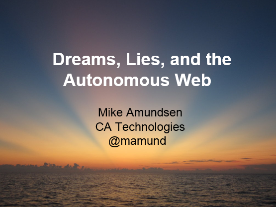In this talk, Mike Amundsen draws on material from social sciences, communication theory, and systems design to outline a future model of computing that relies on fuzzy logic, approximation, and builtin inaccuracies to help create robust machinetomachine communications that can lead to new autonomous software that can go beyond the original programming and result in new functionality and efficiencies when interacting with other systems.